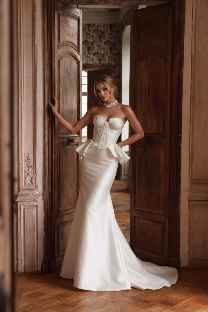 Кружево, вдохновлённое эпохой. Беатрис — это винтажная классика с современным акцентом. Высокая горловина, длинные кружевные рукава, изящный шлейф и корсет с утончённой шнуровкой сзади. Съёмное болеро добавляет загадочности и благородства.