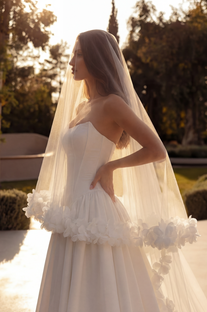 Лёгкая, воздушная, с мягкой плиссированной фактурой, фата красиво ловит движение и создаёт эффект «живой ткани». Она не утяжеляет образ, а наоборот — делает его глубже: добавляет объём, мягкость и ту самую кинематографичность, когда каждый шаг выглядит как кадр из фильма.
