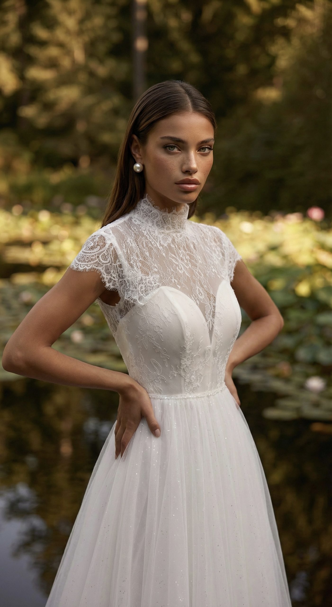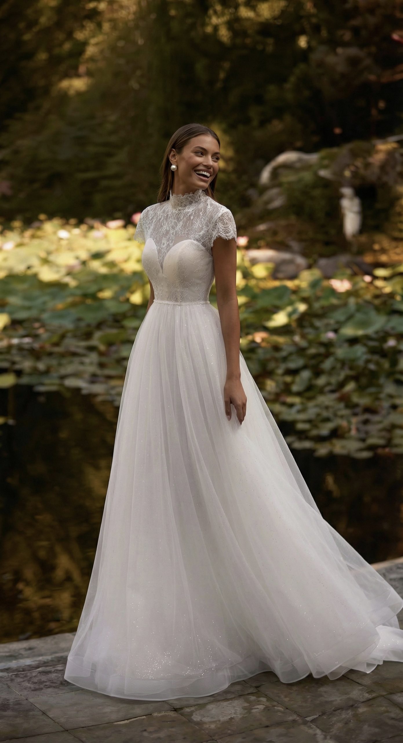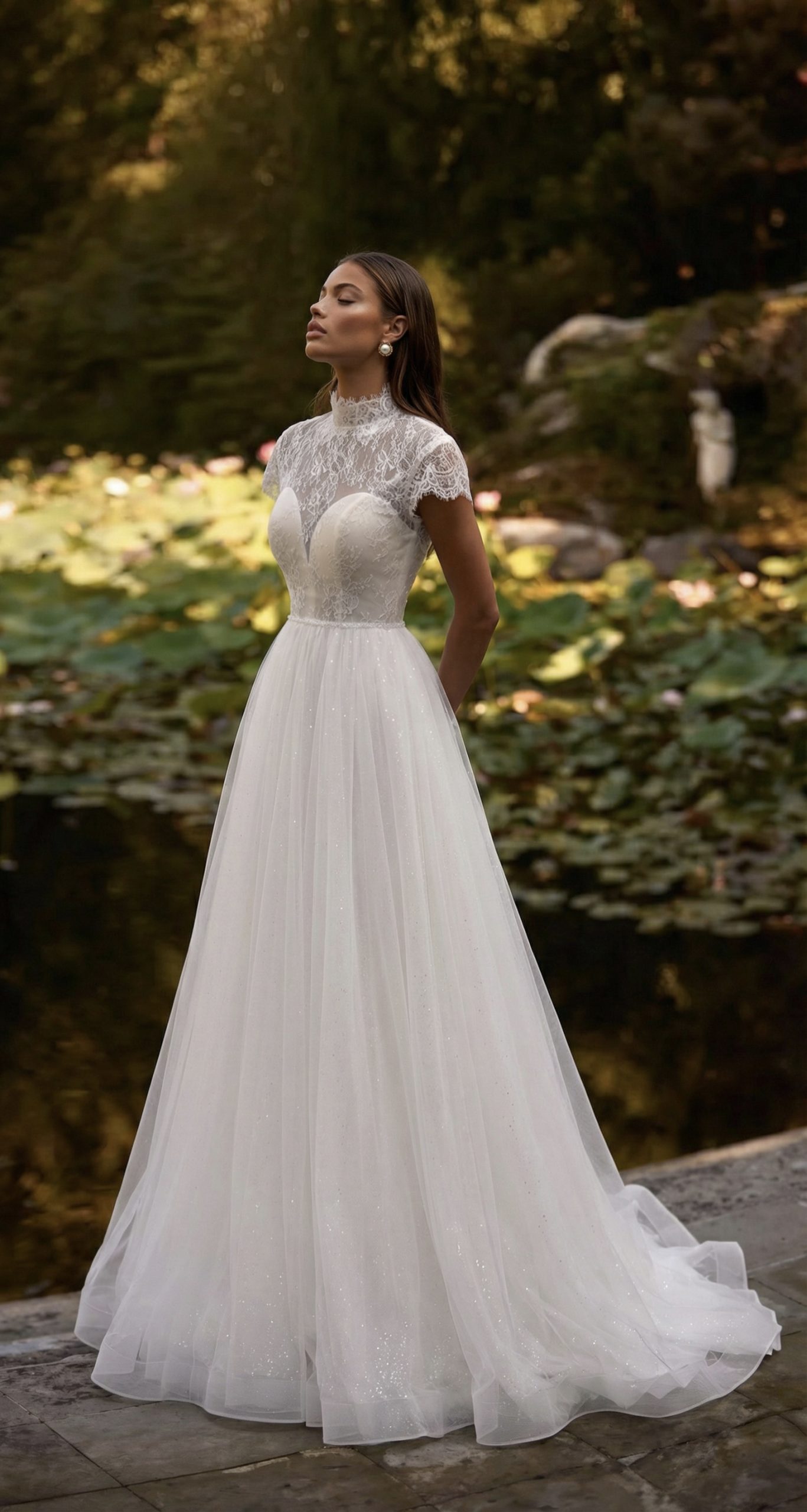 Легкость, в которой чувствуется стиль. Кружевной верх с аккуратной стойкой мягко подчёркивает шею и линию плеч, создавая утончённый и собранный силуэт. Прозрачная спинка с изящной шнуровкой добавляет образу глубины и тонкой романтики. Юбка из воздушного фатина струится мягко и свободно, переливаясь деликатным блеском на свету. В движении платье будто оживает — лёгкое, невесомое, но при этом выразительное.