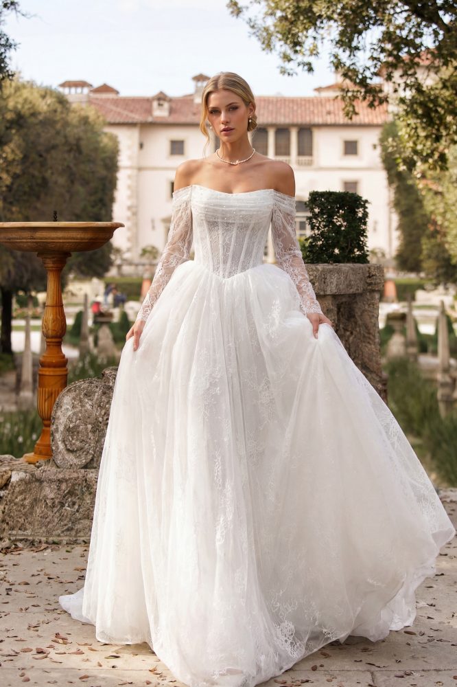 Классический свадебный образ в его самой изящной форме. Корсет с аккуратной кружевной отделкой подчёркивает талию и красиво формирует силуэт, а мягкая линия декольте с открытыми плечами добавляет образу нежности и утончённости.
